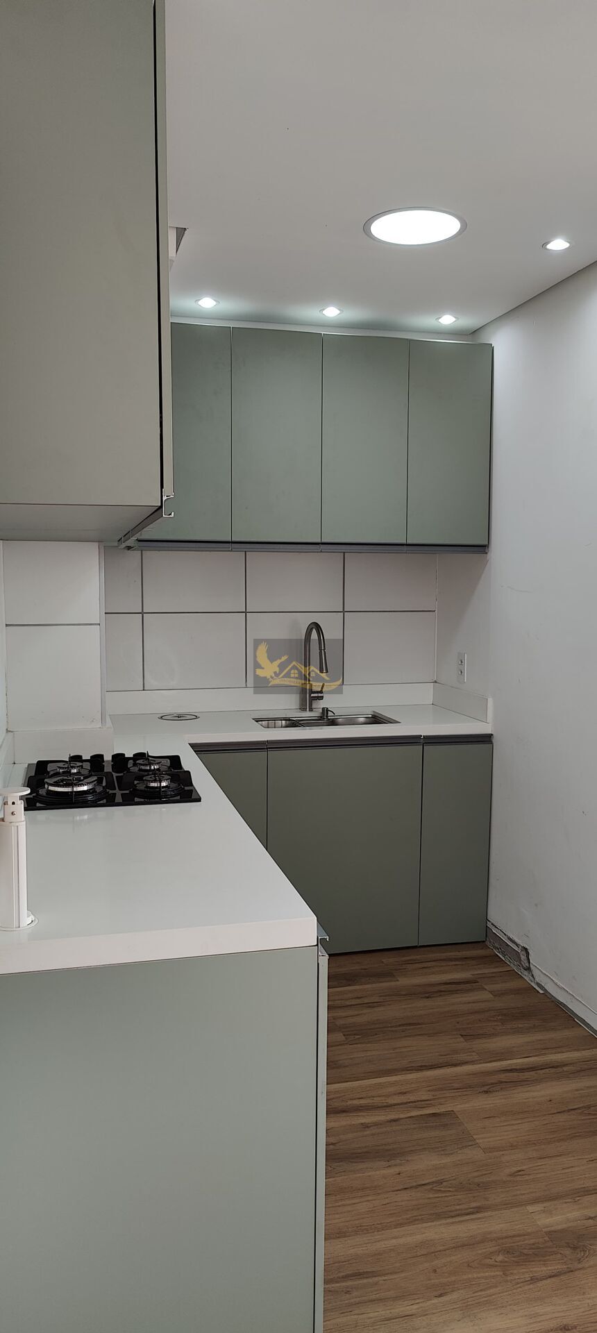 - Pia de quartzo branca em L com torneira gourmet